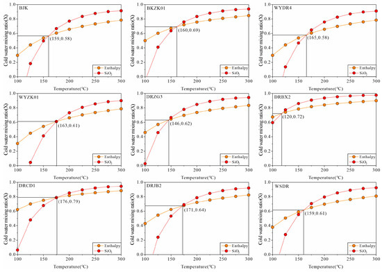 where x denotes the mixing ratio of non-geothermal water; Sc and SiO2c denote the enthalpy of surface water (J/g) and SiO2 content (mg/L), respectively; Sh and SiO2h denote the initial enthalpy (J/g) and initial SiO2 content (mg/L) of geothermal water, respectively; and Ss and SiO2s denote the enthalpy (J/g) and SiO2 content (mg/L) of geothermal water after mixing. The surface water sample YQH1 selected for this calculation has an enthalpy of 2 J/g and a SiO2 content of 7.75 mg/L. Above 100 °C, the relationship between temperature and saturated water enthalpy can be seen in Table 3. Below 100 °C, the saturated water enthalpy is equal to the temperature.