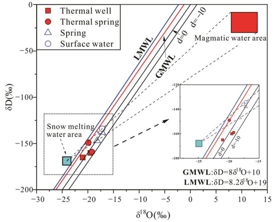 The δD and δ18O values in geothermal water were lower than those in non-geothermal water. The isotope values ranged from δD = −165 to −149‰ and from δ18O = −21.0 to −19.2‰ for geothermal water samples and from δD = −147 to −134‰ and from δ18O = −18.2 to −17.2‰ for non-geothermal water samples. Further differentiation showed that the δD and δ18O contents of thermal well water (from −165 to −160‰ and from −21 to −19.5‰) were poorer than those of thermal spring water (from −159 to −149‰ and from −19.9 to −19.2‰). The δD and δ18O contents of spring water (from −147 to −138‰ and from −18.2 to −17.2‰) were slightly lower than those of surface water (from −136 to −134‰ and from −17.6 to −17.2‰).
