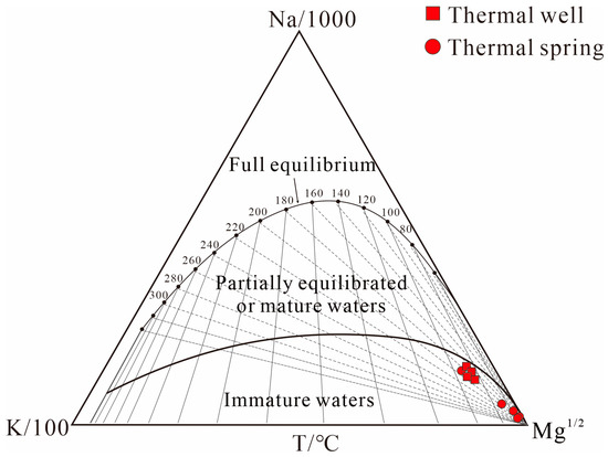 Exploring the causal mechanisms of geothermal systems can help the rational development and utilization of geothermal resources. Hydrochemistry and isotope methods are important for studying the hydrogeochemistry of geothermal water. The characteristics of the hydrochemical components can be used to analyze the degree of water–rock interaction during the deep circulation of geothermal water and to infer the deep thermal storage temperature of geothermal water. Geothermometers obtained from the dissolution equilibrium characteristics of hydrochemical components can be widely used to evaluate the temperature of thermal reservoirs, providing a cost-effective alternative to drilling holes to measure deep thermal reservoir temperatures. The multi-mineral equilibrium method and the silica-enthalpy mixing equation compensate for the significant error of traditional geothermometers in calculating the resulting deep temperature after mixing cold water, enabling a more accurate evaluation of the thermal storage temperature of the geothermal system. Determining the source of recharge is an important part of the geothermal genesis mechanism, and the stable isotope signature of hydrogen and oxygen can be used to determine the source of recharge and the recharge height of the geothermal water to determine the recharge zone [11,12,13,14]. Therefore, it is significant to use the hydrochemical and isotopic characteristics of geothermal water samples to explain the circulation process and formation mechanism of geothermal fluids.