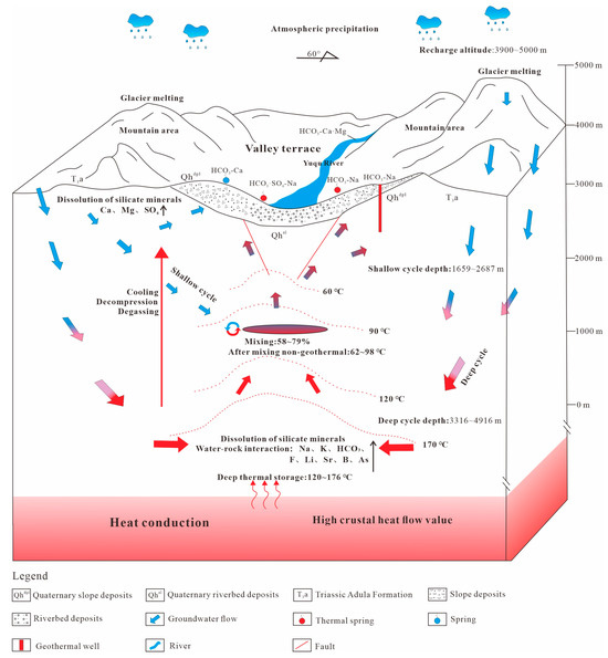 The geothermal system in the Tibet zone can be classified into three genesis types: (1) magma reservoir-type high-temperature geothermal system undergoing cooling in the crust; (2) locally molten geothermal system within the crust in collision zones; and (3) deep circulation heating geothermal system [31,32,33,34]. Geothermal fluids lacking magma heat sources are created by deep heating of groundwater through high heat flow circulation. Wang et al. (2023) relied on the CRUST1.0 model and a large amount of geological data to analyze the distribution characteristics of the crustal heat generation rate in China’s continental areas [35]. The Qinghai–Tibet Plateau was found to have the highest crustal heat flow value (crustal heat flow: 55–75 mW·m−2). This conclusion provides a basis for using a heat source for deep circulation heating geothermal systems. High-temperature geothermal systems such as Yangbajing, Yangyi, Gudui, and Gulu in central and southern Tibet have all been confirmed to have heat sources related to local melting in the crust. Moreover, the chlorine enthalpy model and silicon enthalpy diagram were used to determine the existence of parent geothermal fluid beneath the geothermal field.