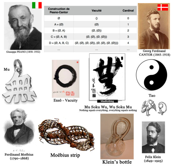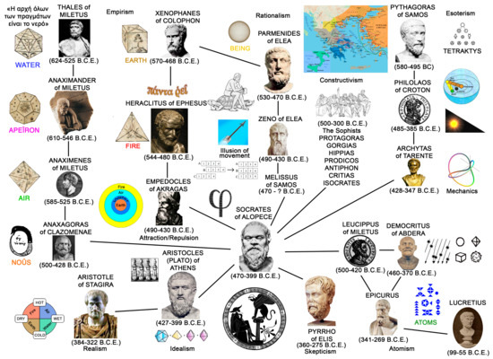 Figure 1, on the left, summarizes these different empiricist philosophies, in which emptiness (Apeiron), consciousness (Nous), matter (Water, Air, Earth), energy (Fire), and force (Attraction/Repulsion) play, in turn, the roles of creative principles. In 540 B.C.E., the Persian conquest forced the Ionians to flee to the far west and found the city of Elea. It was here that Parmenides posited that there are two paths to knowledge. The first is the path of Truth (ἀληθειης, aleitheiês) based on reason. It corresponds to the intrinsic state of nature, a state totally independent (objective) of its observer. Thus, it is with Parmenides that a driving principle (ψυχη, psykhê) appears, capable of giving life (ζωη, Zoê), spirit (νους, nous), and thought (φρονησις, phronêsis) to any material structure. The consequence is that there is a single, eternal (ἀτελεστον, ateleston), and immobile (ἀτρεμες, atremes) Being (το ἐον, to eon). In short, something that is uncreated (ἀγενητον, agenêton) and also imperishable (ἀνωλεθρον, anôlethon), which preserves itself no matter what, allowing us, by reference, to reason about the world. Moreover, Being is non-divisible (οὐλομελε, oulomele, global, without separate members) and homogeneous (ὁμοιον, omoion). Consequently, Being is continuous and One, and, therefore, emptiness does not exist. Since Being possesses all attributes, it possesses, in particular, the attribute of being the limit, and, as such, it cannot be infinite. Thus, this completed Being that fixes eternal permanence is clearly opposed to Anaximander’s infinite Apeiron, a generator of intrinsic change.