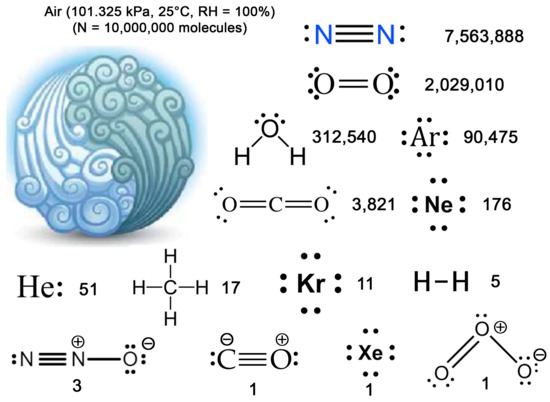 Air seen as a collection of 14 gaseous molecules. The number associated with each molecule gives its molar proportion for a total of 10,000,000 molecules.