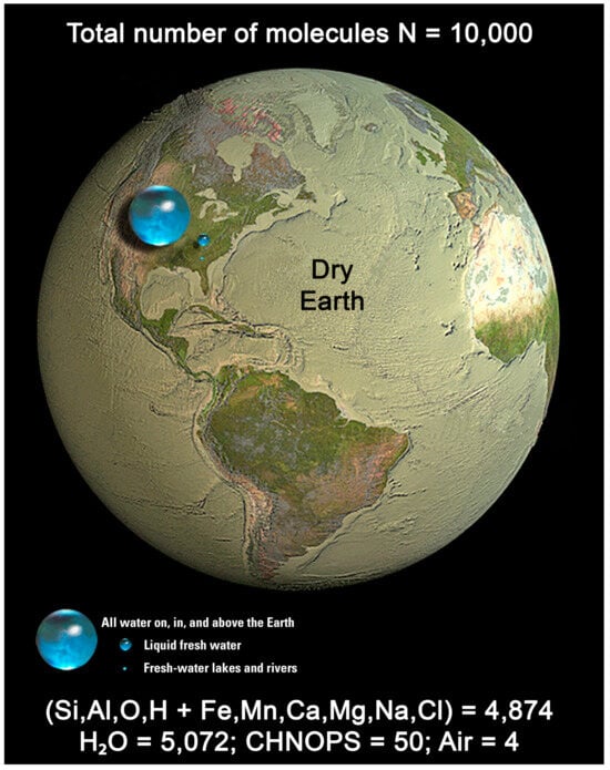 Comparison between the volume of the earth and the volume of terrestrial water with the molar proportions of the elements making up minerals, water, soil organic matter (CHONPS) and air for a total of 10,000 molecules. Credits: Howard Perlman USGS, Jack Cook, Woods Hole Oceanographic Institution, Adam Nieam. Data source: Igor Shiklomanov: https://www.usgs.gov/media/images/all-earths-water-a-single-sphere (accessed on 1 July 2024).