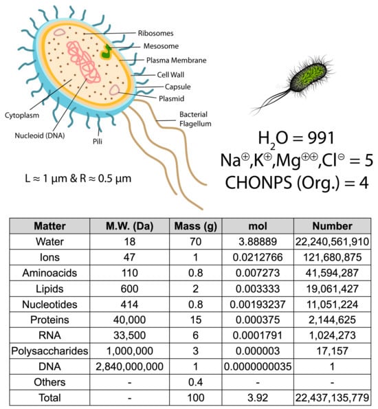 Let us take a look at an extreme case of an object that, from the outside, does not look like water. Yet, it is essentially water. We are talking here about a living cell of the prokaryotic type (see Figure 4). Taking a bacterium like Escherichia coli, what we see is a cylindrical body covered with very fine hairs. Several flagella emerge from the cylinder, enabling the bacterium to move around independently. In short, we are dealing with a living being, not inert matter subject to external disturbances. Now, let us take a look at what we find inside this bacterium (see the table accompanying Figure 4). This table lists the main constituents and their relative proportions [7]. As we have become accustomed to doing, let us transform all the measured masses into moles. The result is indisputable. This living thing is 99.1 mol% water. In other words, if we count to 1000, we will find 991 water molecules, 5 mineral ions, and 4 molecules based on highly varied combinations of carbon, hydrogen, oxygen, nitrogen, phosphorus, or sulfur (CHONPS). In other words, E. coli bacteria can be summed up as a drop of slightly salty water “polluted” by a few rare organic molecules. Or, if you prefer, that all biology books, no matter how thick, speak, in brief, of only 4‰ of the matter present. All the rest, or 994‰ of this matter, is a matter of water containing minerals.