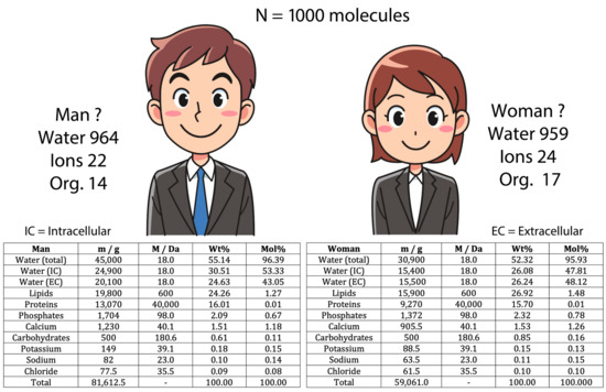 This applies to all living beings. Take a human being, for example. If we look inside and out, we see skin, organs, and bones. But if we take into account that all these objects are made up of cells, we would expect water to be the predominant molecule. Figure 5 lists the molecules present in a human body [8]. The relative molar proportions totally confirm this point of view. Thus, a man, boils down to 964 mol‰ of water molecules, containing 22 mol‰ of dissolved minerals and 14 mol‰ of molecules based on the CHONPS elements. For women, it is slightly different. There is a little less water (959 mol‰) and more minerals (24 mol‰) or organic molecules (17 mol‰). So, there is an awful lot of water in a male or female human being. In fact, the novelty for bodies made of eukaryotic cells, compared to a simple prokaryotic bacterium, is that there are the two following types of water: immobile intracellular water and extracellular water that moves. It is in this respect that men differ from women. In a man, there is slightly more intracellular water (533 mol‰) than in a woman (478 mol‰). Which means, of course, that we have the opposite situation for extracellular water, as follows: 430 mol‰ in men versus 481 mol‰ in women. In other words, the sexualization of human beings is primarily linked to water, more than to the shape of organs or the XX or XY nature of chromosomes. Even with surgery to change sex (organs) or the genetic manipulation of chromosomes, male bodies will always have more extracellular water than female ones.