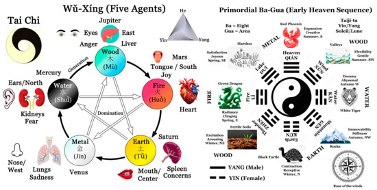 All this is to highlight that Chinese culture far precedes Western culture, where the notion of elements refers to concepts of form, substance, and quality. In China, on the other hand, we tend to speak of agents of transformation, and, therefore, of processes or changes. These changes refer to the cosmos, the terrestrial world, and human nature. To sum up, in China, we assume the existence of a fundamental principle forming and animating the universe, breathing life into it, the one, called Tao. Tao then creates the yin–yang pair associated with the number two. Yang is a masculine, sonorous principle (music) symbolized by the Sun, associated with all that is bright, luminous, and hot (gas) and is always in motion. In contrast, Yin is feminine and silent (rite), symbolized by the Moon, associated with all that is dark, obscure, and cold (solid) and is at rest. But because of the Tao in the background, Yang and Yin are by no means static principles. On the contrary, they are dynamic entities that allow for Ch’i or Q’ì to circulate. When Ch’i circulates, what is light and clear tends to rise towards the sky. What is dark and heavy, on the other hand, tends to fall to the ground. A well-known symbol of this dynamic Yin/Yang duality is the “Tàji Tú”, which features two spirals of opposite chirality. One is white, the other black. But both are interlocked, with black and white dots superimposed. Hence, the dynamic, since at any moment, the white spiral can become black and vice versa.