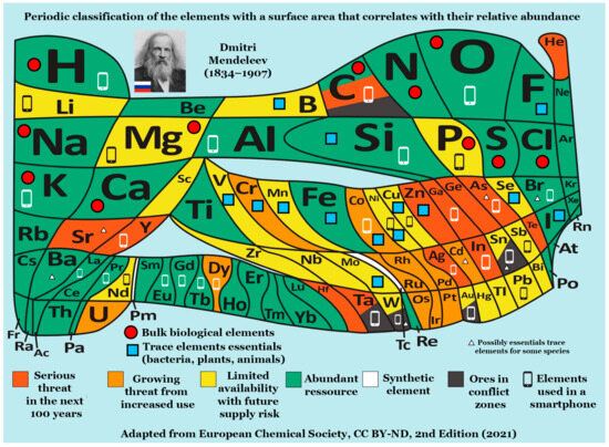 Dmitri Mendeleev’s Periodic Table of the Elements, showing the relative abundances on earth via the size of the cells. This table also shows the elements that are absolutely essential for making a cell phone or a living cell.