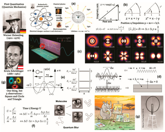 Summary of first quantum physics according to Heisenberg and Schrödinger. (a) Instability of the atom according to Newton’s and Maxwell’s classical laws. (b) Necessity of using complex numbers with a real part and an imaginary part. (c) Equivalence between a complex number and a wave (left) and probability clouds for electrons around nuclei (right). (d) Wave/corpuscle duality and indeterminacy relations. (e) Quantifying energy in an infinite potential well. (f) Indeterminacy relations between position x and momentum p, explaining the existence of a “quantum blur”. (g) Artistic representations of this first quantization.