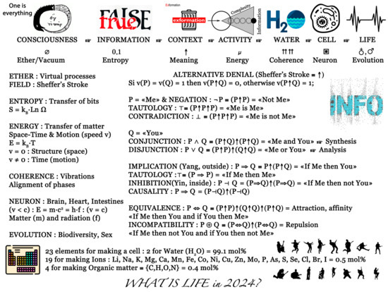 This paper suggests that life is an inevitable phenomenon from the moment the three following ingredients mix: water, mineral ions derived from the elements (Na, K, Mg, Ca, B, V, Cr, Mn, Fe, Co, Ni, Cu, Zn, Mo, Si, P, S, Se, F, Cl, and I), and organic matter based on the quadrette (C, H, O, and N). As it is stars that synthesize atomic nuclei and electrons that neutralize the positive electric charges of these nuclei, life can only be a phenomenon of a profoundly quantum nature. Furthermore, as the water molecule is by far the largest constituent of a cell, the theory of relativity also comes into play. To understand this substance with the formula H2O, we need to call on the quantum physics of second quantization fields, and not on the quantum physics of first quantization. Finally, one last science is absolutely necessary to explain the complexity of the living world, as follows: the thermodynamics of irreversible processes [1,2]. These different ingredients are, more often than not, largely ignored by conventional biologists, who see the living cell as an object obeying the following laws of classical physics: Newton’s equations for the mechanical aspect and Maxwell’s equations for the electromagnetic aspect. As for the reactivity aspect, it draws heavily on the thermodynamics of chemical equilibria, focusing on the notion of energy. The entropy aspect is only taken into account to model chemical potential via the notions of enthalpy H(P,V) and “free” energies known as Gibbs G(T,P) or Helmholtz F(T,V). Because of these theoretical limitations, one phenomenon closely linked to life remains a profound mystery—consciousness. While consciousness is clearly manifest in human beings, there is growing evidence to suggest that it also exists in animals, plants, and even in the single-celled world of bacteria.