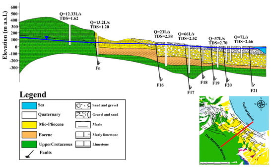 - Bachtouli, S.; Abidi, M.; Comte, J.C.; Zairi, M. Potential for fresh submarine groundwater occurrence in an arid Mediterranean region: The case of Gulf of Gabes, Tunisia. Hydrogeol. J. 2024, 32, 359–378. [Google Scholar] [CrossRef]
