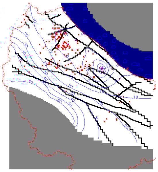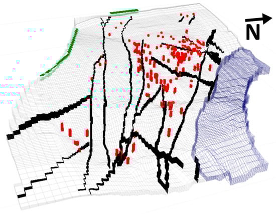 Groundwater extraction was simulated using the Well package, which distributed an average pumping rate across 173 wells scattered throughout the model domain (Figure 3). This distribution reflects current extraction practices and helps assess their impact on the aquifer system. The horizontal flow barrier (HFB) package was employed to simulate compressive faults with a thickness of 1 m and an initial hydraulic conductivity (K) of 1.0 × 10−9 m/s. These faults were modeled to analyze their potential role as flow barriers or preferential pathways, impacting groundwater flow direction and behavior. Consistent with the climatic setting of the area and considering that the aquifer within the modelled area was confined, we did not consider any atmospheric boundary conditions, hence we did not involve any recharge from rainfall.