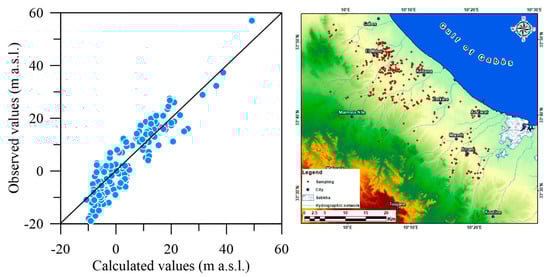 Left panel: scatter diagram of the observed head (m) versus calculated head (m) values for the simulated confined aquifer. Right panel: position of the observation wells.