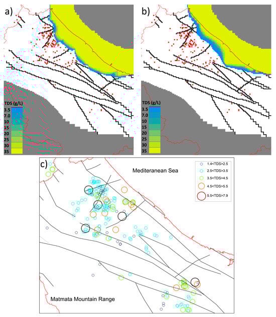 Contours of the calculated groundwater salinities for the confined aquifer, for the scenarios with maximum pumping rates recorded in 2020 used for the whole simulation time (upper left panel (a)), and increasing pumping rates over time from 1970 to 2023 (upper right panel (b)). Here the red line represents the watershed the red squares represent the pumping wells and the black lines the faults. The observed salinities are depicted in the lower panel (c).