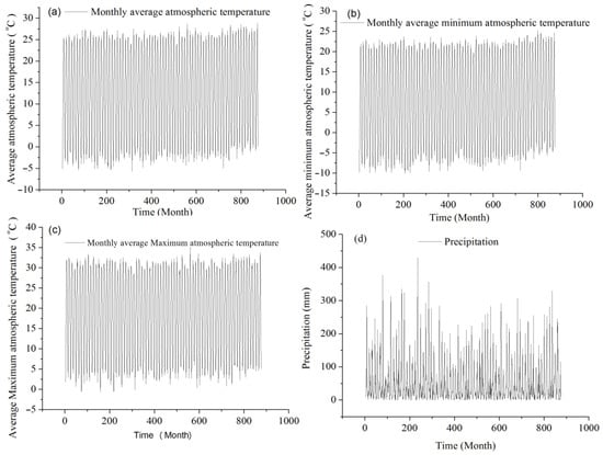 Original data on monthly climate change in Weifang city from 1951 to 2023. (a) change of monthly average minimum atmospheric temperature, (b) change of monthly average minimum atmospheric temperature, (c) change of monthly average maximum atmospheric temperature, (d) change of monthly precipitation.