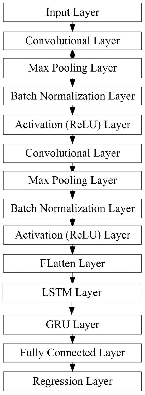 CNN-LSTM-GRU combines the advantages of CNN, LSTM, and GRU (Figure 3). It extracts implicit features by sequentially inputting time-series data sequences into the CNN network and then inputting the data into the LSTM and GRU networks for temporal dependency and pattern feature extraction. Finally, it outputs the prediction results.