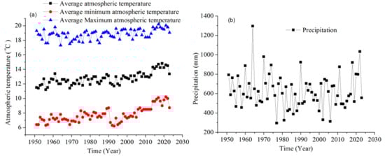 Annual climate change in Weifang from 1951 to 2023. (a) annual change of average minimum air temperature, average minimum air temperature, and average maximum atmospheric temperature; (b) annual change of precipitation.