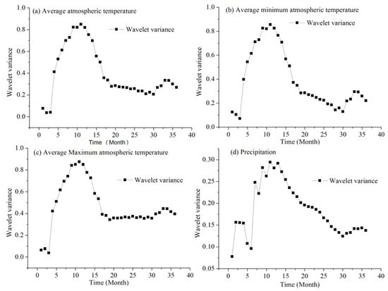 The periods of monthly climate change in Weifang city are calculated using wavelet analysis (Figure 6). The wavelet variance determines the main periods of monthly climate change. There is a maximum peak of 11. These are the periods of monthly average air temperature, monthly average minimum air temperature, monthly average maximum air temperature, and monthly precipitation. The monthly variation of temperature is mainly influenced by solar radiation, especially the seasonal variation of solar radiation. The solar activity cycle is approximately 11 years. Therefore, the input variables of the deep learning models are 11.