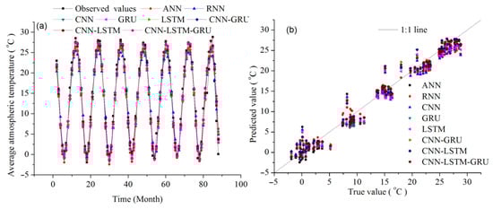 The obtained results of this study show that CNN-LSTM-GRU has the highest R values and the lowest RMSE and MAE values for the monthly climate prediction for all elements, including monthly average air temperature (MAAT), monthly average minimum air temperature (MAMINAT), monthly average maximum air temperature (MAMAXAT), and monthly precipitation (MP), while CNN-LSTM closely follows CNN-LSTM-GRU. From CNN-LSTM-GRU to ANN, the RMSE and MAE increase, and R decreases (Table 2, Table 3, Table 4 and Table 5). Therefore, deep learning model performance can be ranked as CNN-LSTM-GRU > CNN-LSTM > CNN-GRU > LSTM > GRU > CNN > RNN > ANN. The eight deep learning models have good generalization ability. CNN extracts multidimensional data features, GRU and LSTM, and has modeling capabilities for long-term dependencies in sequence data processing, and the CNN-LSTM-GRU hybrid model can further improve model prediction accuracy. The CNN-LSTM-GRU model provides a new predictable model for climate change. The hybrid model’s ability to predict air temperature and precipitation is crucial for water resource management and early-warning systems in flood risk management.