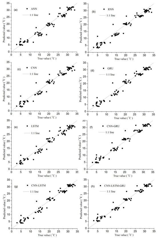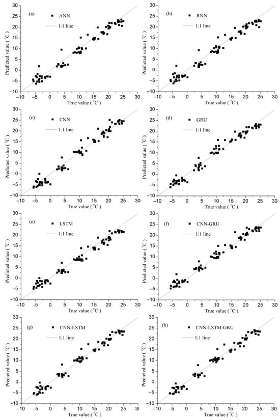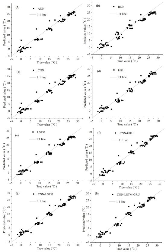 Comparison of observed and predicted MAAT values for each model. (a) results of ANN, (b) results of RNN, (c) results of CNN, (d) results of GRU, (e) results of LSTM, (f) results of CNN-GRU, (g) results of CNN-LSTM, (h) results of CNN-LSTM-GRU.
