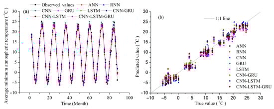 Table 3 shows the results of different deep learning (DL) models. The hybrid CNN-LSTM-GRU in the predicting phase has better assessment criteria, with R = 0.9886, RMSE = 1.4856 °C, and MAE = 1.1218 °C, respectively. Figure 9 and Figure 10 show results comparing the measured and predicted monthly average minimum air temperature (MAMINAT) using different DL models. Also, the forecasted values of CNN-LSTM-GRU are closer to the measured values compared to the ANN, RNN, CNN, GRU, LSTM, CNN-GRU, and CNN-LSTM models.