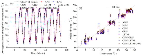 The CNN-LSTM-GRU model shows the best performance in predicting MAMAXAT with R (0.9832), RMSE (1.7843 °C) and MAE (1.2523 °C), while the CNN-LSTM model also showed the better performance in forecasting MAMAXAT than other deep learning models (Table 4). Figure 11 and Figure 12 show the measured and predicted monthly average maximum atmospheric temperature (MAMAXAT) using deep learning models in 2016–2023, demonstrating that the past 11 months’ data play a vital role in the MAMAXAT prediction.