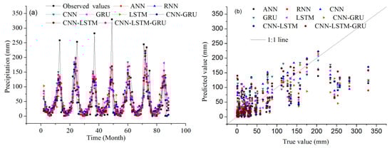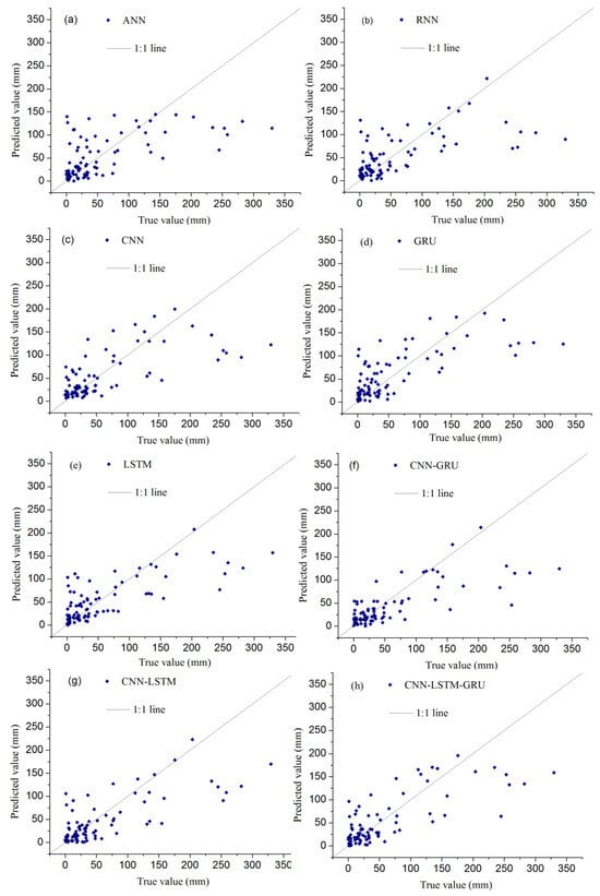 Comparison of observed and predicted precipitation values for each model. (a) results of ANN, (b) results of RNN, (c) results of CNN, (d) results of GRU, (e) results of LSTM, (f) results of CNN-GRU, (g) results of CNN-LSTM, (h) results of CNN-LSTM-GRU.