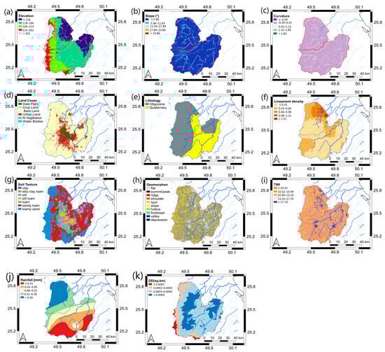 Thematic parameters of GWP shown as: (a) elevation (m), (b) slope degrees, (c) curvature, (d) land cover, (e) lithology (geology), (f) lineament density, (g) soil texture, (h) geomorphology, (i) topographic wetness index (TWI), (j) rainfall (mm), and (k) drainage density, respectively.