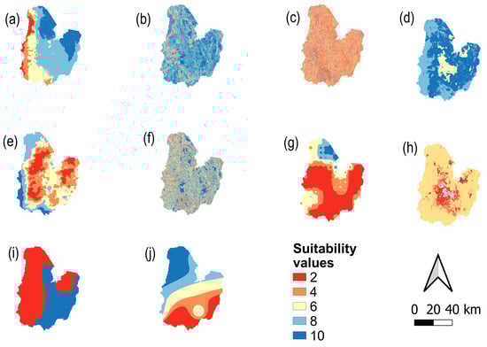 GWP thematic layers’ suitability values based on the assigned ratings and weights, in which (a) elevation (m), (b) slope degrees, (c) curvature, (d) soil texture, (e) drainage density, (f) topographic wetness index (TWI), (g) lineament density, (h) land cover, (i) lithology (geology), (j) rainfall (mm), respectively.