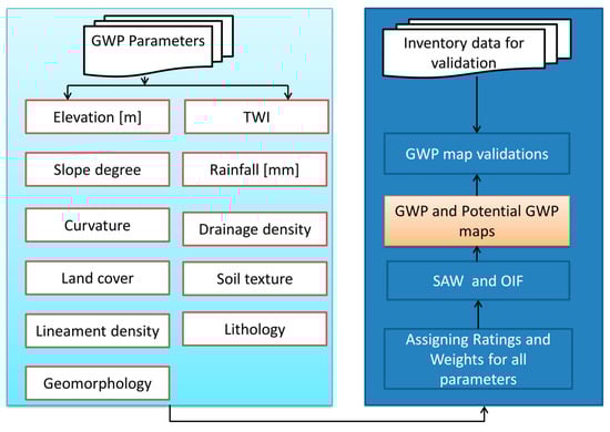 Aiming to validate the obtained GWP maps, the available groundwater wells (vectors file) and frequency ratio approach were used in order to spatially link the wells to the classes of GWP map so as to calculate the frequency (density) of wells allocation inside every class. To achieve so, well sites were primary rasterized, and then the acquired GWP maps were utilized to overlay the rasterized ones. In this operation (i.e., overlay analysis), both maps’ pixels were combined at the identical positions. Thus, the results were documented and tabulated with as a cross-table []. From the obtained cross-table, pixels (points) within each GWP class were obtained by using a table aggregation function. The GWP maps were considered valid when approximately 50 percent of the well sites were located to the “moderate” and “high” GWP maps classes. In other words, when 50 percent of the historical points (wells) occurs on the “moderate”, “high”, or both GWP maps classes, it mean that the groundwater index is accurate and yields satisfactory results. Figure 4 shows the flowchart of the adopted methodology for GWP mapping.