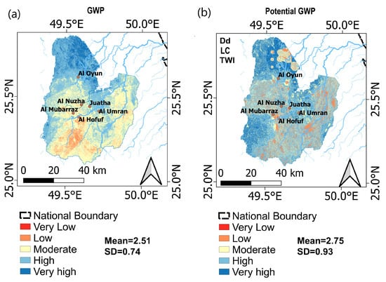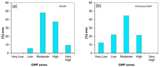 The spatial distribution of GWP and potential GWP zones over the study site (a) according to the original GWP index and (b) according to the potential GWP index.
