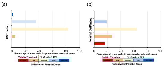 For more consistency, it was essential to authenticate the acquired GWP maps. Accordingly, the first step followed for producing the GWP map was to assess its fitness and dependability through utilizing a validation approach. Figure 6a,b shows the well’s frequency ratio (wells density), calculated through the “cross-overlay analysis” process, that has arisen within every GWP class within every GWP map. Both maps demonstrated a moderate level of agreement with the delineated GWP zones, exceeding the specified threshold by a significant margin. Moreover, over 50% of the ‘good’ points fell within the moderate GWP zone, further corroborating this observation. In terms of concordance for the ‘moderate’ GWP class, both maps yielded acceptable results. The GWP map showed a 66% correspondence with the moderate zone (Figure 6a), while the potential GWP map exhibited a 51% correspondence (Figure 6b).