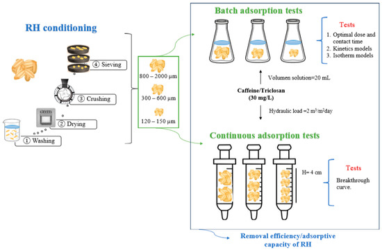 In this work, the removal of caffeine and triclosan from synthetic solutions using raw RH in batch tests and fixed-bed columns was studied. RH was characterized to determine how its constituents/characteristics influence the adsorption process. Batch tests were performed to determine the optimal conditions to remove both contaminants. The kinetics was determined fitting the experimental data to pseudo-first-order, pseudo-second-order, Elovich, and diffusion models. Meanwhile, Langmuir, Freundlich, and Sips models were used to model the equilibrium experimental data. Moreover, in order to determine whether RH could be used in full-scale applications (treating a greater amount of water), tests were carried out in fixed-bed columns. The data obtained were fitted to the Bohart–Adams model.