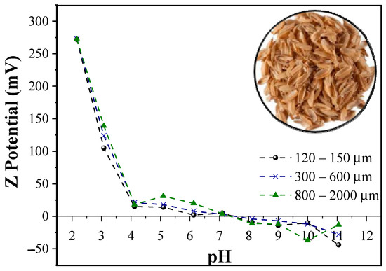 The point of zero charge (pHpzc) of RH was determined using a set of Erlenmeyer flasks containing 50 mL of distilled water each. The pH was adjusted between 2 and 11 using 0.01 M NaOH and HCl solutions. RH (mass = 0.5 g) was added, and samples were shaken at 150 rpm for 48 h. The test was carried out for the three particle sizes in duplicate.