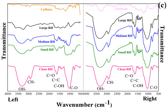 After caffeine/triclosan adsorption under the same conditions for all RH sizes, the spectra of three RH sizes showed changes. Modifications in the intensity of bands around 2924–3500 and 1100–1490 cm−1, which are related to lignin, cellulose, and hemicellulose, were evident. The intensity of the band around 1598 cm−1, assigned to the carbonyl group, changed after adsorption. The intensity after caffeine/triclosan adsorption suggest chemical reactions/attraction forces between caffeine/triclosan molecules and the functional groups of the RH surface [21].