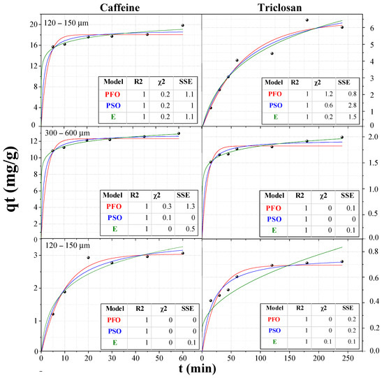 Kinetics models for adsorption of caffeine and triclosan (concentration = 30 mg/L) on three particle sizes. Doses for caffeine/triclosan: small particles = 4.0/1.5 g/L; medium size particles: 8.5/2.5 g/L; and large particles: 50/10 g/L. Agitation rate = 150 rpm. Black points = experimental data; red line = pseudo-first-order model (PFO); blue line = pseudo-second-order model (PSO); green line = Elovich model (E).