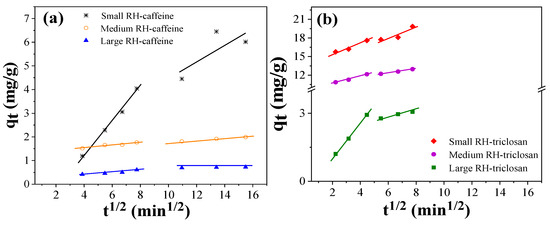 Intraparticle diffusion kinetics for adsorption of (a) caffeine and (b) triclosan.