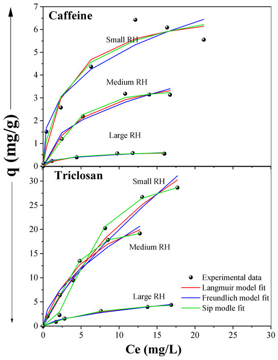 On the other hand, the parameter values and the fittings to the Langmuir, Freundlich, and Sips isotherm models are shown in Table 1 and Figure 7, respectively. The adsorption of caffeine and triclosan fit well to the three isotherm models used. Nevertheless, the adsorption in the small (caffeine, triclosan), medium (caffeine, triclosan), and large (triclosan) RH particles show a better fitting to the Langmuir and Sips models (R2 > 0.91).