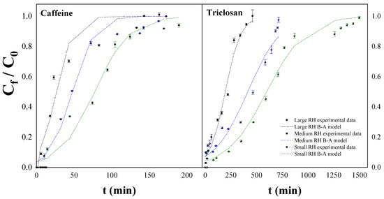The main results obtained in fixed-bed columns are summarized in Table 2. The tests in the fixed-bed columns were carried out to determine the influence of the bed height and the hydraulic load on the three particle sizes of RH to remove caffeine/triclosan. The efficiencies achieved in the removal of caffeine and triclosan using the three sizes of RH at bed heights of 4, 5 and 8 cm did not show significant differences (p > 0.05). On the other hand, the hydraulic load (4 m3/m2-day) produced clogging in the columns that used the small RH at 30 min of operation (spillage of the caffeine/triclosan solution was observed at the top of the column), so it was not possible to construct the breakthrough curve for this hydraulic load and establish its influence on the three particle sizes. The experimental breakthrough curves for the three RH particle sizes using a bed of 4 cm heigh and with a hydraulic loading rate of 2 m3/m2-day are presented in Figure 8.