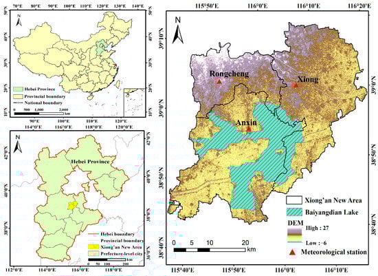 The Xiong’an New Area is situated in the eastern region of Baoding, Hebei Province, China. It covers an area of approximately 1700 square kilometers. It encompasses the Xiong, Rongcheng, and Anxin counties, along with their surrounding areas (Figure 1). It is positioned on the alluvial fan of the Daqing River system in Haihe River Basin. The terrain of the Xiong’an New Area is high in the northwest and slightly low in the southeast, with a natural longitudinal slope of about 1‰. The soil layer is deep, and the vegetation coverage is very low, while there are several ancient river channels within the area. The mountainous area accounts for 64.1% of the land area, comprising mainly forests and grasslands in the west of the basin. The plains comprise mainly farmland and cities [33]. Baiyangdian Lake, North China Plain’s largest freshwater lake, is located southeast of the Xiong’an New Area. It receives water from nine upstream river branches of the Daqing River System. The Xiong’an New Area has a warm, temperate, monsoonal continental climate with a dry spring, wet and rainy summer, cool and dry autumn, and cold and little snow in winter. The average annual temperature is 12.4 °C, the average annual precipitation is approximately 500 mm, and the maximum annual precipitation is 942 mm. The Xiong’an New Area has a history of frequent flooding. During flood years, the low-lying areas near rivers and lakes are prone to submersion, accounting for 20% to 30% of the total region. During severe flood years, except for the high-lying areas of Rongcheng County, approximately 80% of the area is inundated [15,16].