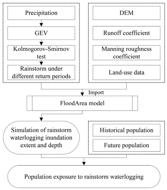 The primary objective of this study was to analyze the dynamic changes in population exposure to rainstorm waterlogging in the Xiong’an New Area. The flow chart of this study is shown in Figure 2, below. Initially, this study utilized the generalized extreme value distribution (GEV) function to calculate the daily precipitation of different return periods and assess the fitting results using the Kolmogorov–Smirnov (K–S) test [35]. Subsequently, the FloodArea hydrodynamic model incorporated daily precipitation data, DEM, ground roughness, and runoff coefficient data to simulate the depth and extent of inundation caused by the 24 h rainstorm. Finally, the inundation results were overlaid with historical and future population grid data to conduct a comparative analysis of the scale and spatial distribution of the affected population in the Xiong’an New Area for different return periods of rainstorm-induced inundation.