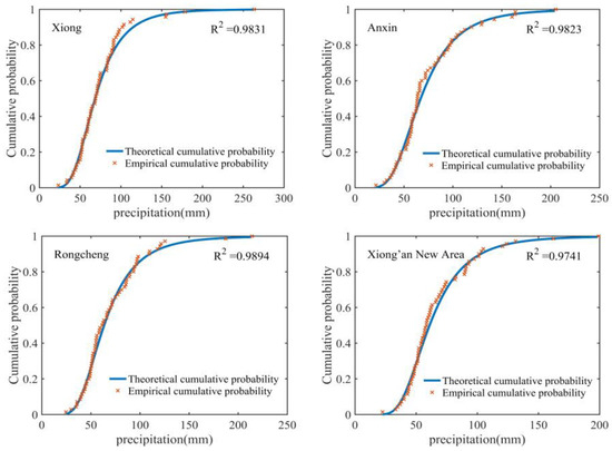 Given a sample xl…… xn of random variables has distribution function F, where Fn is the empirical distribution function of the sample, and Dn reflects the maximum difference between the empirical distribution function Fn(x) and the specified distribution function F(x), so a smaller Dn indicates a better fit and can be used as a basis for preference. This paper concluded the test by comparing Dn with the critical values that were calculated at different levels of significance. The K–S test statistics of 0.0422, 0.0371, 0.0491, and 0.0475 for Rongcheng, Xiong, and Anxin Counties, and the Xiong’an New Area, respectively, were smaller than the critical value (0.1623) at a significance level of 0.05, and the correlation between the theoretical cumulative probability distribution and the empirical cumulative probability distribution reached more than 0.97 (Figure 3). This indicated that the generalized extreme value distribution function was a good fit.