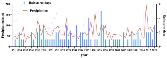 Rainstorm days and annual maximum daily precipitation in the Xiong’an New Area from 1951 to 2020.
