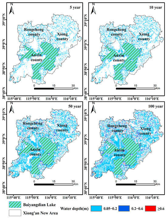 The FloodArea model simulated the inundation depth and inundation area for 24 h for 5-, 10-, 50-, and 100-year rainstorms in the Xiong’an New Area. The results are depicted in Figure 5 and Table 4. It was observed that the impact resulting from water depths below 0.05 m was relatively insignificant. Consequently, the calculation of inundation areas was conducted based on three distinct depth categories: 0.05–0.2 m, 0.2–0.6 m, and greater than 0.6 m. Notably, Baiyangdian Lake was excluded from the calculation.