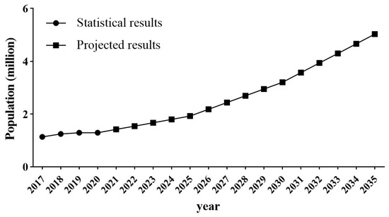 Figure 6 illustrates the population changes in the Xiong’an New Area from 2017 to 2035. The projected population of the Xiong’an New Area in 2035 is expected to reach 5.03 million. Compared with the establishment of the Xiong’an New Area in 2017, the population is expected to increase by 3.9 million, and the population growth rate by 342%. The projected results show that the population in 2035 will closely align with the planned population of 5 million noted in the planning report for the Xiong’an New Area.