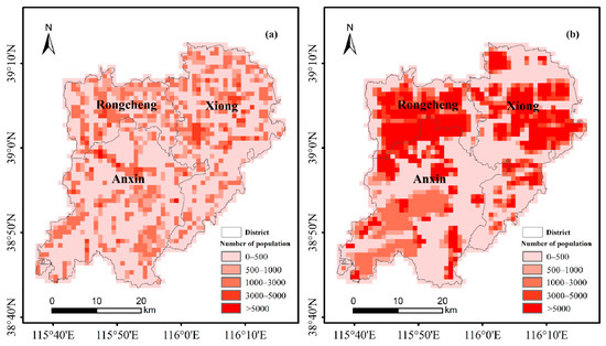 Spatial distribution of the population in 2017 (a) and 2035 (b) under SSP2.