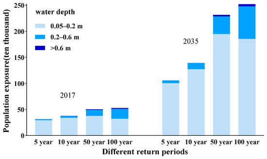The variations in population exposure to different water depths in 2017 and 2035 showed similar characteristics. The majority of the population was exposed to water depths ranging from 0.05 to 0.2 m. Within this range, the proportion of the exposed population to the total population exposure was 93.2%, 89.7%, 74.8%, and 60.6% in 2017, and 94.9%, 91.4%, 84.1%, and 73.6% in 2035 for the 5-, 10-, 50-, and 100-year return period rainstorms, respectively. Conversely, the lowest population exposure was found at inundation depths above 0.6 m, and it accounted for 0.4%, 0.9%, 2.4%, and 3.6% of the total population exposure in 2017, and 0%, 0.05%, 1.3%, and 1.6% in 2035. The percentage of population exposure at the 0.05–0.2 m water-depth interval decreases as the return period increases, while the proportion changed at the water depths of 0.2–0.6 m and above 0.6 m in the opposite direction.