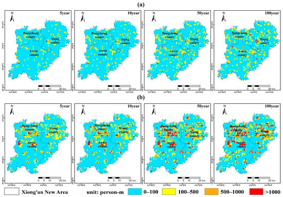 The spatial distribution patterns in population exposure exhibited a consistent trend across the four return periods, as depicted in Figure 9. In 2017, population exposure was low (<100 person-m) in most of the regions, with only a few high-population-exposure (>1000 person-m) areas occurring in urban and rural residential regions. The high-population-exposure areas increased by 16 km2, with a rate of 533%, from the 5-year to 100-year return period rainstorms. From 2017 to 2035, the population exposure areas expanded significantly under the four return periods. The areas with high population exposure increased by 25 km2, 44 km2, 91 km2, and 112 km2 for the return periods of 5-, 10-, 50-, and 100-year rainstorms, respectively. The increase became greater as the return period lengthened. From the 5-year to the 100-year return period rainstorms, the high-population-exposure areas increased from 28 km2 to 131 km2, and the proportion of the total area increased from 1.6% to 7.4%. According to future urban planning and development, the residential population will become increasingly concentrated, and more people will migrate to the start-up and peripheral areas of the Xiong’an New Area, which will have a high population exposure in 2035.