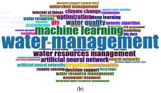 In order to ascertain the precise significance of this work, a topic evaluation is conducted utilizing the R Studio and Scopus databases (Bibliometrix library). Streamflow prediction using machine learning approaches and sensitivity analysis are not heavily considered by researchers, as indicated by the keyword assessments (Figure 1a); hence, this concept can be regarded as innovative. Furthermore, water management, artificial intelligence, streamflow prediction, and machine learning are prevalent topics within scientific communities. However, as shown in Figure 1b, neither Iranian enterprises nor researchers have made significant advancements in these areas. As a result, senior-level managers in Iran should assess the results of the current investigation as an innovative resolution.