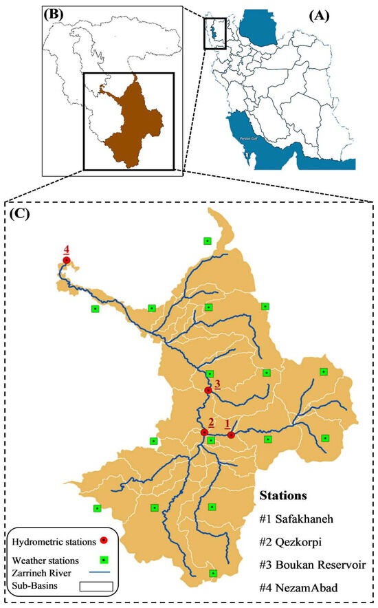 Study Area Map (A) Iran Map; (B) West Azerbaijan Province Map; (C) Zarrine River Basin Map.