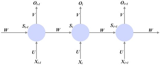 By using the network’s depth as an approximation of time, an RNN can simulate the correlation present in sequential data. However, the vanishing and bursting gradient problems make the RNN model less accurate as the time span becomes longer, which affects the final output [52]. Mathematically, the RNN model shown in Figure 3 can be represented as follows: